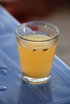 冷めないよう、お湯入りのコップの中にグラスを沈めてある。